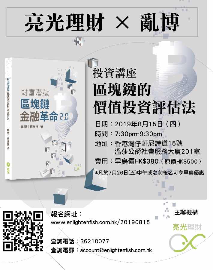 區塊鏈的價值投資評估法 講座,於7月26日(星期五)中午或之前報名,可享早鳥價優惠 $380, 原價 $500