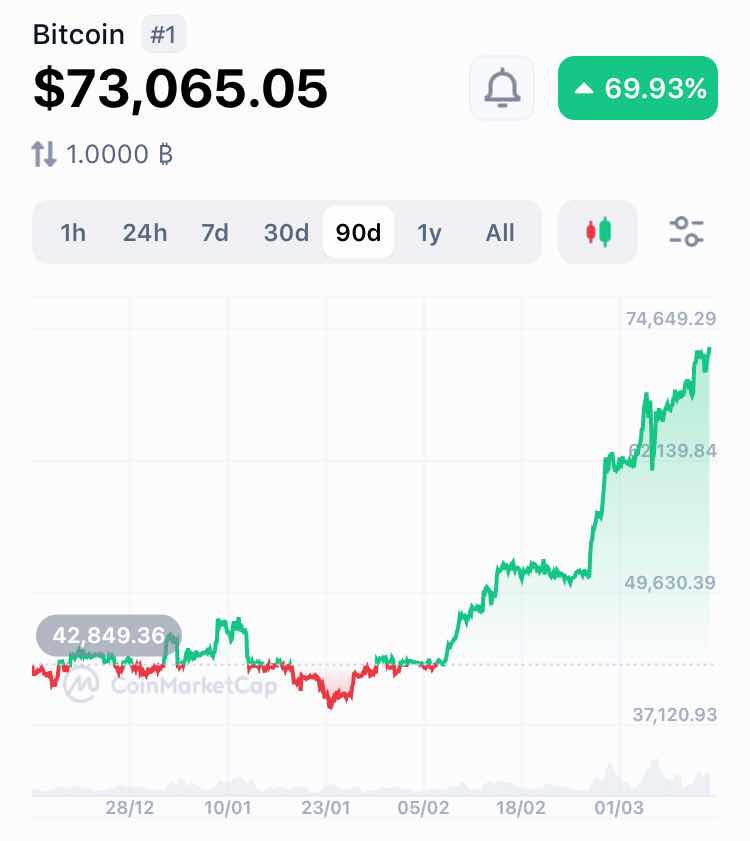 比特幣價格升至73,000美元一枚,作為加密貨幣早期投資者,是應該發文講幾句。